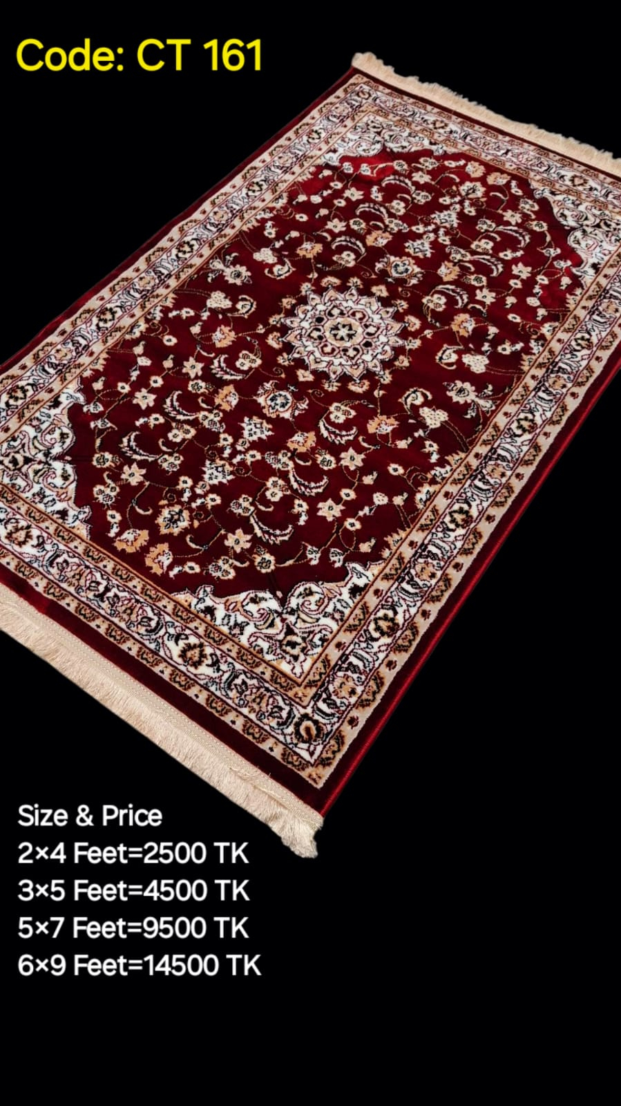 কার্পেটের অনেক গুলা সাইজ আছে। সাইজ ভেদে দামের ও পরিবর্তন হবে। আমাদের কাছে আছে: