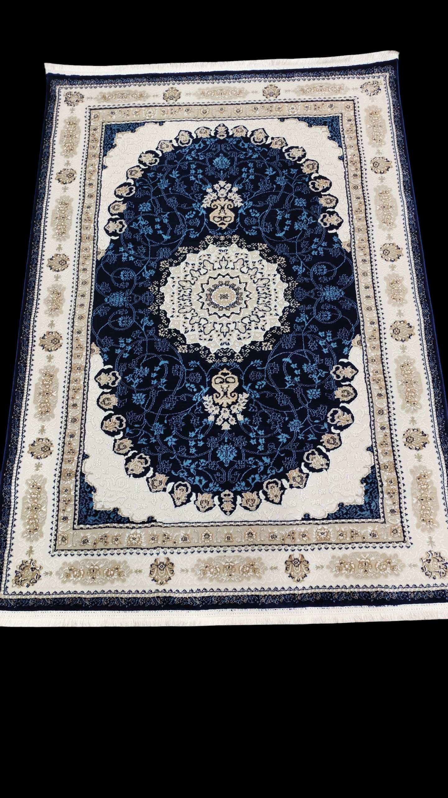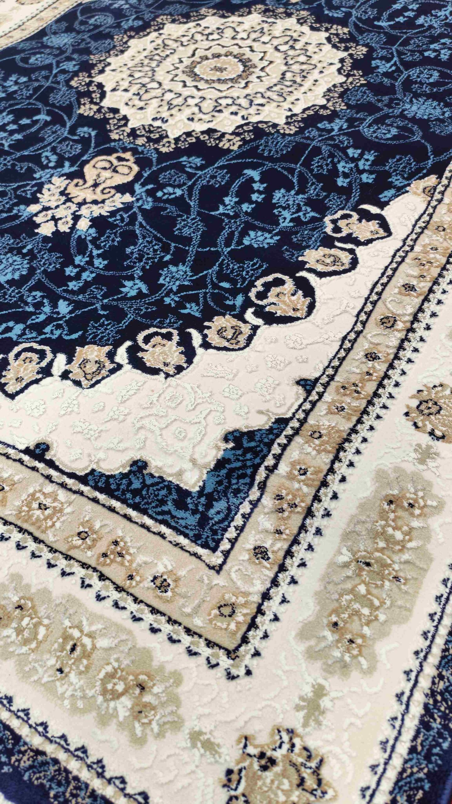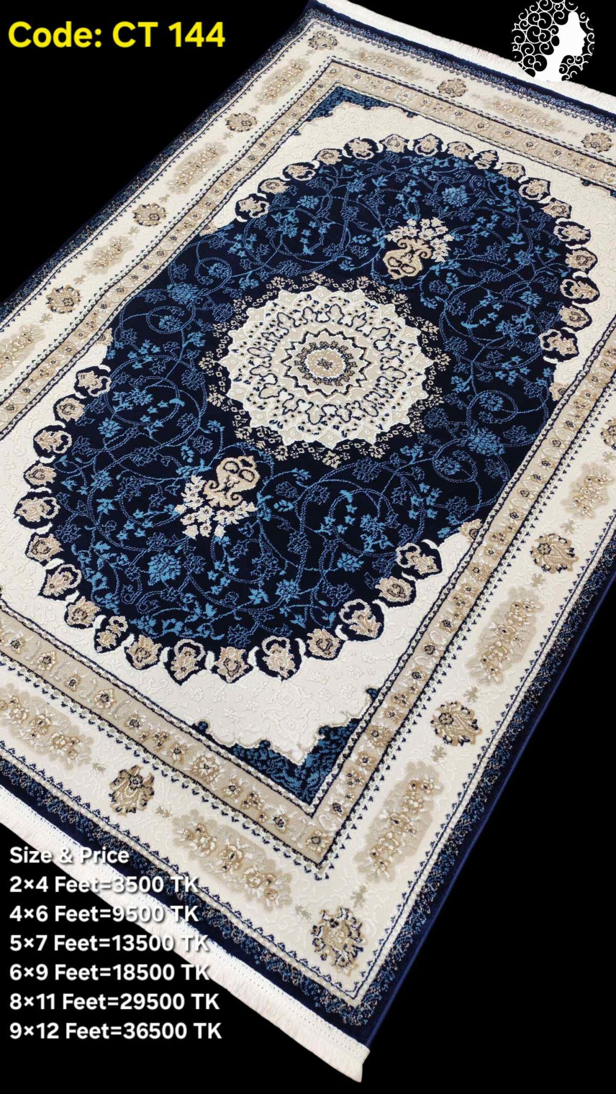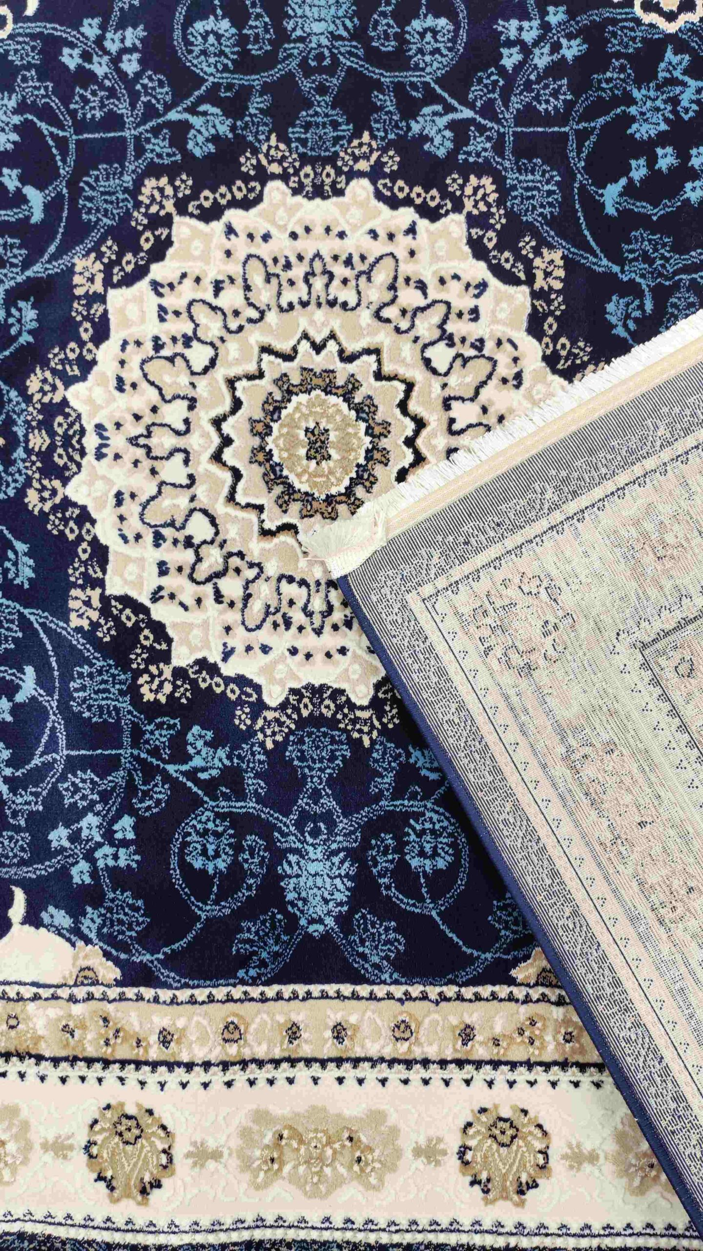 গভীর নেভি ব্লু ও এলিগ্যান্ট আইভরি ক্রিম কালারের দারুণ মিলনে তৈরি এই কার্পেটটি আপনার ঘরের পরিবেশকে আরও রিচ ও লাক্সারিয়াস লুক দেবে।