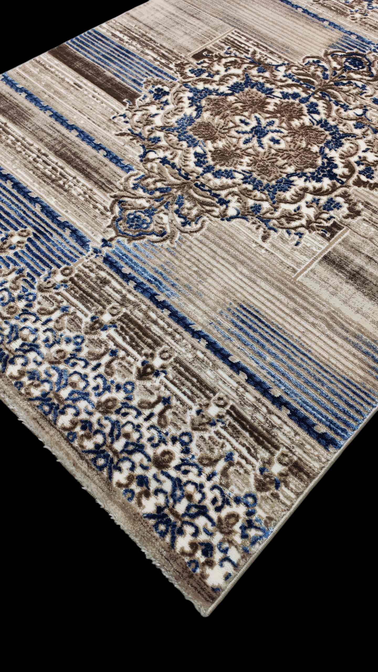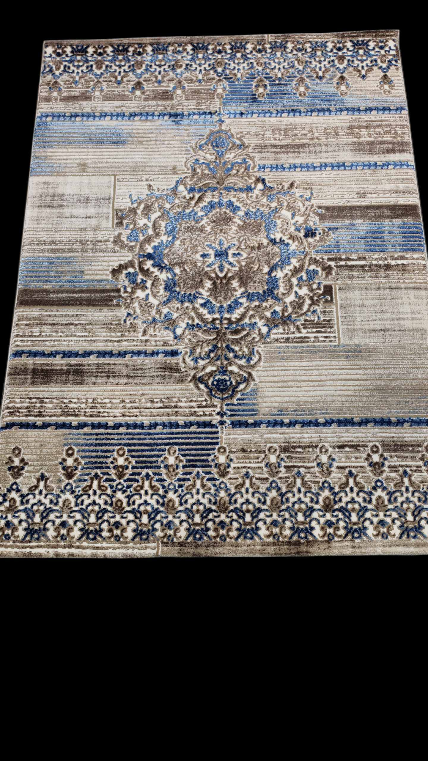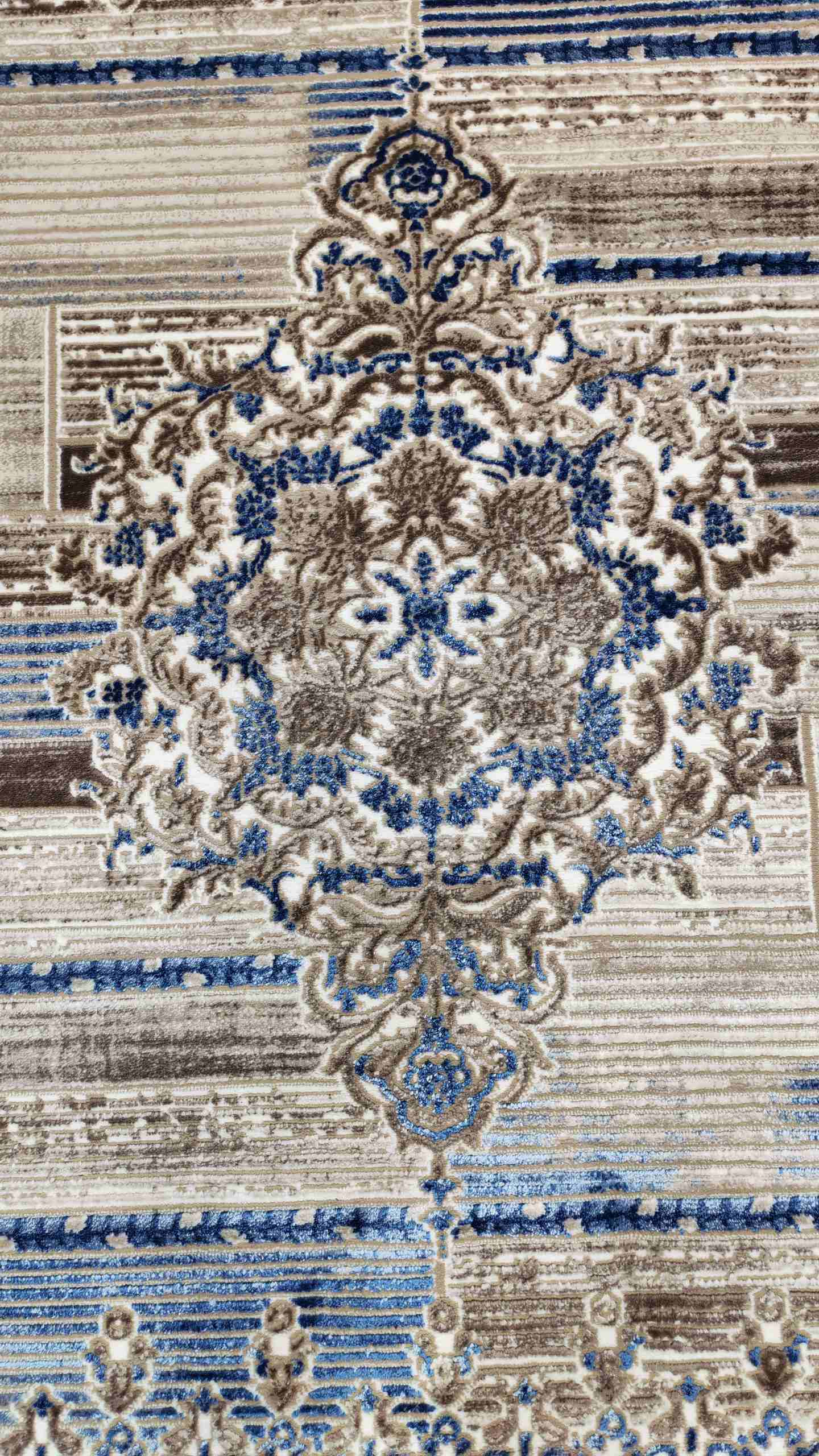 শৈল্পিক নকশা: কার্পেটটির কেন্দ্রে রয়েছে একটি নিখুঁত “সেন্ট্রাল মেডালিয়ন” ডিজাইন এবং চারপাশে রয়েছে স্ট্রাইপ ও ফ্লোরাল প্যাটার্নের এক অনন্য মেলবন্ধন।