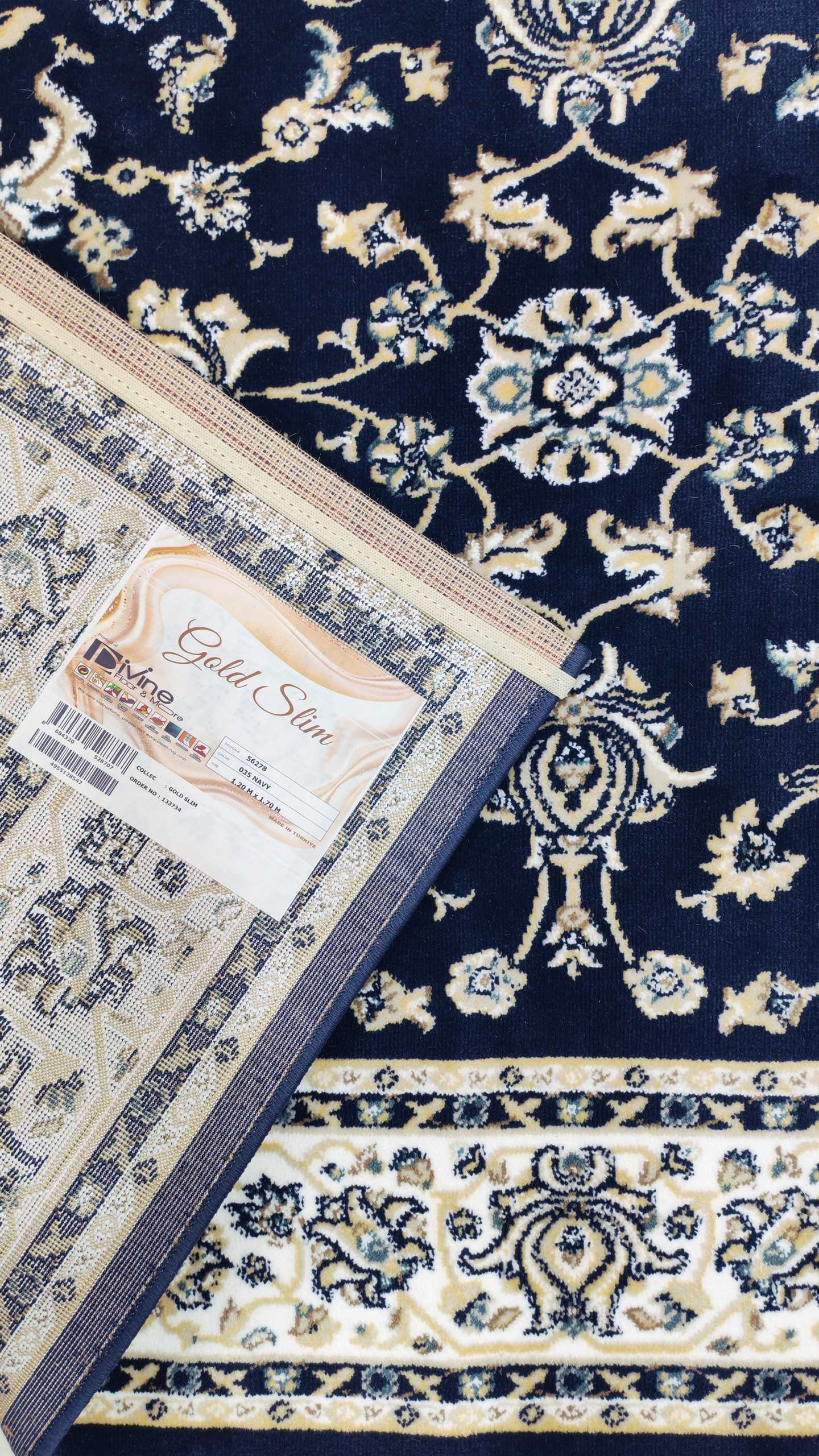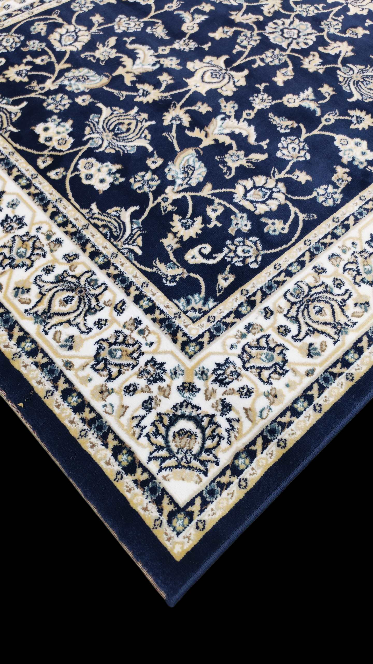 রয়্যাল নেভি ব্লু ডিজাইন: কার্পেটটির গভীর নেভি ব্লু ব্যাকগ্রাউন্ড এবং এর ওপর সাদা ও গোল্ডেন ফ্লোরাল নকশা যেকোনো ঘরে রাজকীয় আবহ তৈরি করে।